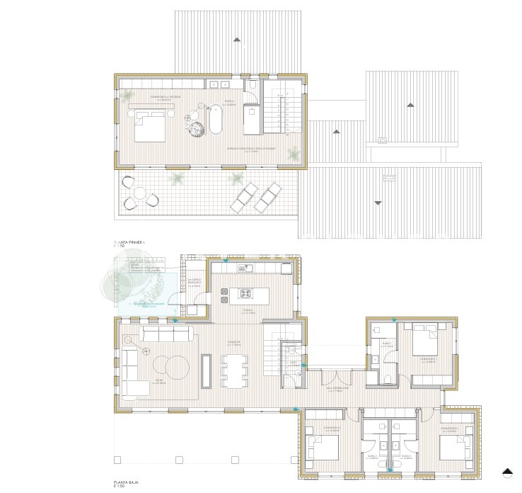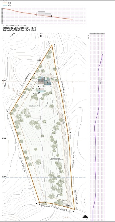 La parcela tiene una superficie de 17.956 m² y la vivienda proyectada cuenta con una superficie construida de 264 m², distribuida en planta baja y planta superior. Está formada por dos cuerpos que deslizan entre sí, unidos por un porche-terraza. Entre dichos cuerpos se realiza el acceso a la vivienda. En la planta baja hallamos el acceso, estar, cocina-comedor y 3 dormitorios dobles con baño en suite, así como un aseo y la escalera de acceso a la planta superior, donde se encuentra 1 habitación doble con baño en suite y vestidor. Además de una piscina de 35 m², con 37 m² de porche, y 96 m² de terrazas.