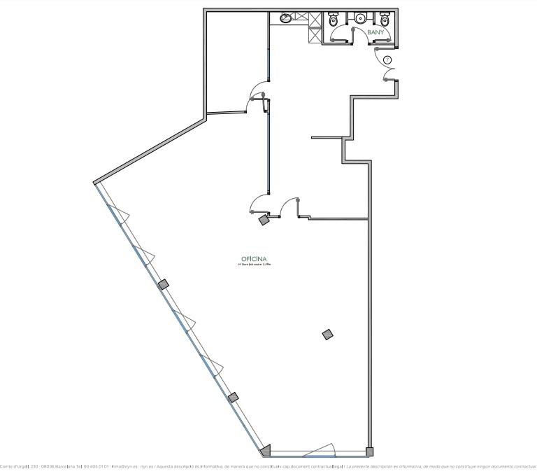 Compte amb molta llum i ventilació natural, finestres practicables i estors interiors, il·luminació fluorescent encastada en fals sostre, diverses divisòries, climatització individual per splits, zona office i un bany.